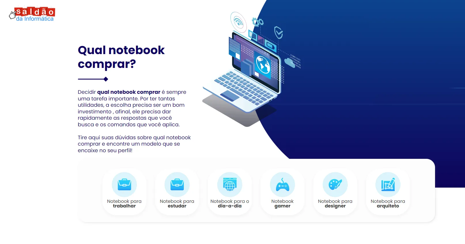 Desenvolvi uma landing page interativa para a empresa Saldão da Informática, utilizando HTML, CSS e JavaScript. Esta página foi projetada para ajudar os clientes a escolherem o notebook ideal, aumentando a conversão de vendas.