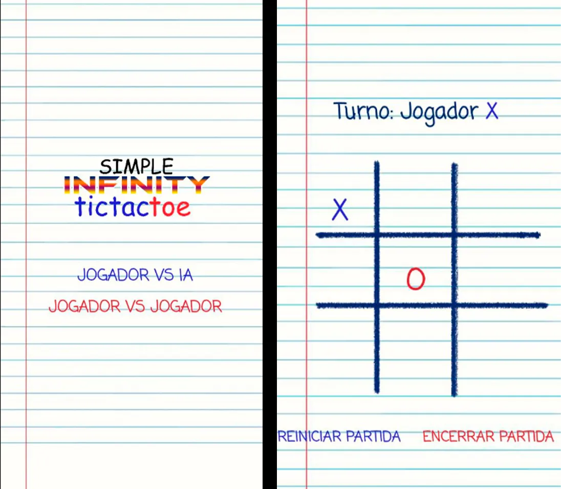 Desenvolvi um jogo da velha simples e infinito para Android utilizando Kotlin. Este jogo permite que os jogadores se desafiem em partidas contínuas, onde cada jogador pode ter até três jogadas simultâneas na tela. A quarta jogada de um jogador substituirá a primeira, criando uma dinâmica única e contínua.